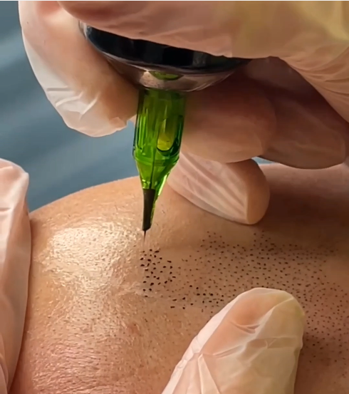 Farbpigmente werden mit feinen Nadeln in die Haut eingebracht. Sie werden so gesetzt, dass sie wie feine Haare oder Haarstoppeln aussehen. So wird der Eindruck von dichterem Haar erzeugt. Die präzise platzierten Haarpigmentierungen werden perfekt - in Form und Farbe - auf Ihre individuellen Bedürfnisse abgestimmt und erzeugen den Eindruck einer dichten Haarstruktur.