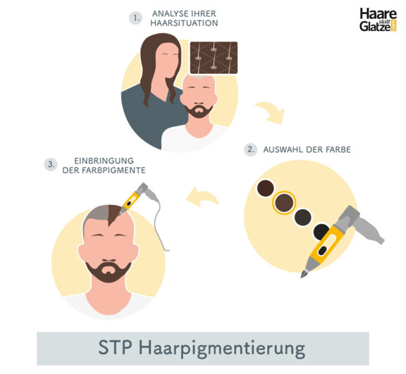 zu einem zunehmend dunkleren Haarbild, das im Endresultat perfekt zur natürlichen Haarfarbe passt. Aufgrund der unterschiedlichen Stärken der Kopfhaut verblasst die pigmentierte Farbe nach einer STP-Behandlung in der Regel nicht gleichmäßig – deshalb werden mit nachfolgenden Sitzungen erforderliche Verbesserungen der Farbnuancen umgesetzt und so das Ergebnis optimiert.