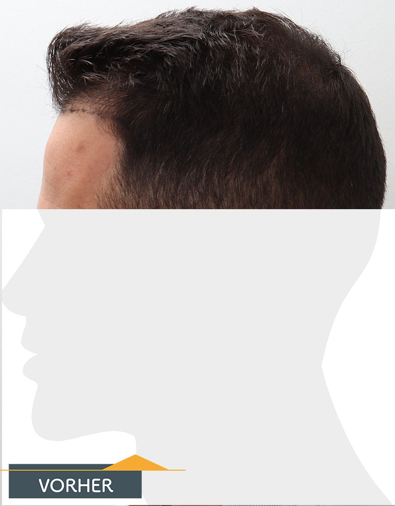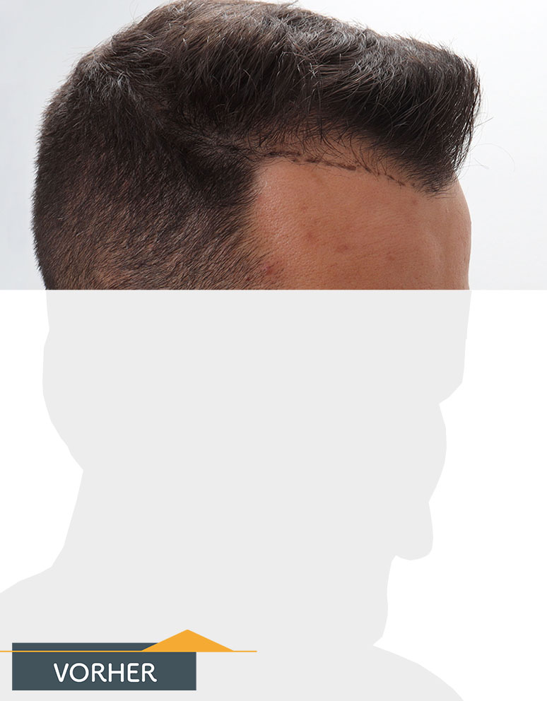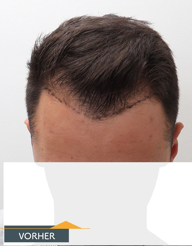 Hier wurden 1.000 FUs mit der FUE-Technik entnommen und im Bereich der Geheimratsecken verpflanzt.
